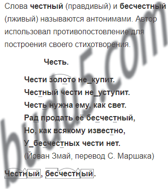 Прочитай стихотворение. Автор выразил в нём очень важную мысль с помощью однокоренных слов. Найди эти слова, подумай над значением слов честный и бесчестный. Как называются эти два слова? Какой приём использовал автор для построения своего стихотворения?