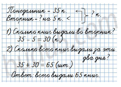 В понедельник в школьной библиотеке выдали 35 книг, а во вторник - на 5 книг меньше. Сколько книг выдали за эти два дня?