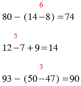 | 80 - (14 - 8) | 12 - 7 + 9 | 93 - (50 - 47) |