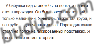 У бабушки над столом была полка, а на полке стоял пароходик. Пароходик был совсем настоящий, только маленький. У пароходика была жёлтая труба, и на трубе — два чёрных пояса. Пароходик важно стоял на полке на лакированных подставках. Я глаз от пароходика не мог оторвать.