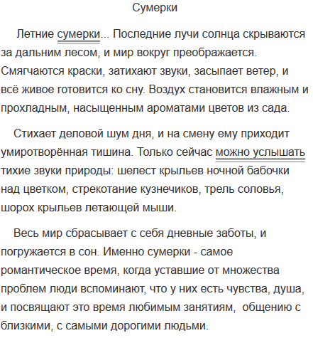 Сочинение. Понаблюдайте за наступлением сумерек и опишите свои впечатления. Озаглавьте текст. Подчеркните односоставные предложения (если вы их употребили).
