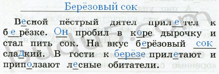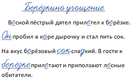 В_сной пёстрый дятел прил_тел к б_рёзке. _ пробил в к_ре дырочку и стал пить сок. На вкус б_рёзовый __ сла_кий. В гости к __ прил_тают и прип_лзают л_сные обитатели.