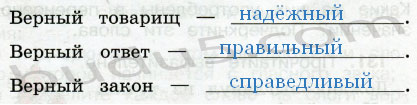 Прочитайте. Определите, что обозначает слово верный в каждом выражении. Выберите и напишите нужное слово.