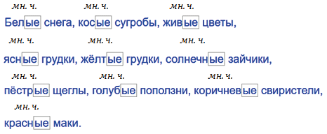 Имена прилагательные: белые, косые, живые, ясные, жёлтые, солнечные, пёстрые, голубые, коричневые, красные.