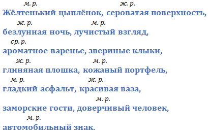Жёлтенький цыплёнок, сероватая ..., безлунная2 ..., лучистый2 ..., ароматное ..., звериные ..., глиняная ..., кожаный2 ..., гладкий ..., красивая ..., заморские3 ..., доверчивый ..., автомобильный ... .