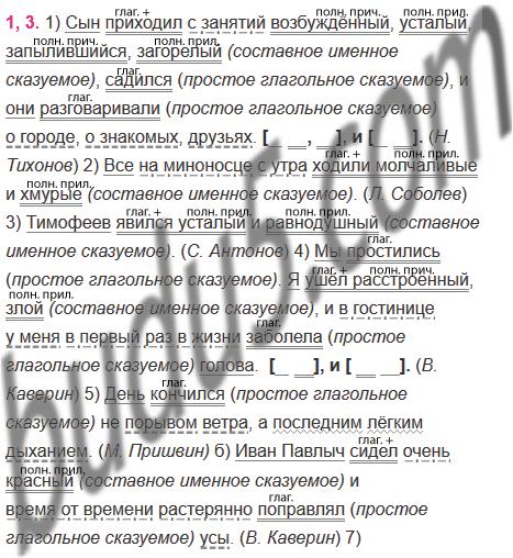 1) Сын приходил с занятий возбуждённый усталый запылившийся загорелый садился и они разговаривали о городе о знакомых друзьях. (Н. Тихонов) 2) Все на миноносце с утра ходили молчаливые и хмурые. (Л.Соболев) 3) Тимофеев явился усталый и равнодушный. (С. Антонов) 4) Мы простились. Я ушёл расстроенный злой и в гостинице у меня в первый раз в жизни заболела голова. (В. Каверин) 5) День кончился не порывом ветра а последним лёгким дыханием. (М. Пришвин) б) Иван Павлыч сидел очень красный и время от времени растерянно поправлял усы. (В. Каверин) 7) Хороши летние туманные дни, хотя охотники их и не любят. (И. Тургенев) 8) Пруд едва начинает дымиться. (И. Тургенев) 9) Глаза у неё сделались совсем покорные, виноватые... (В. Потанин)