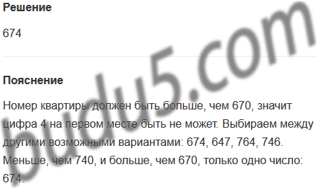 4. В трёхзначном номере квартиры использованы цифры: 4, 6, 7. Запиши номер квартиры, если он больше, чем 670, но меньше, чем 740.
