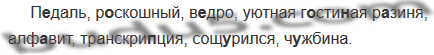 П..даль, роскошный, в..дро, уютная г..сти(н, нн)ая р..зиня, алфавит, транскрипция, сощурился, ч..жбина.