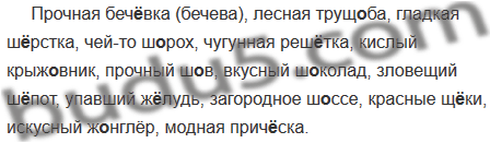 Прочная беч..вка (бечева), лесная трущ..ба, гладкая ш..рстка, чей-то ш..рох, чугунная реш..тка, кислый крыж..вник, прочный ш..в, вкусный ш..колад, зловещий ш..пот, упавший ж..лудь, загородное ш..ссе, красные щ..ки, искусный ж..нглёр, модная прич..ска.