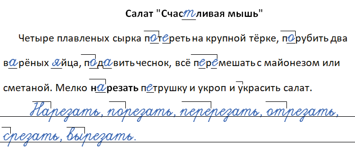 Вставим пропущенные буквы: счастливая - счастье (непроизносимая согласная), потереть - тёрка (безударная гласная), порубить, варёных - ва́рит, яйца - я́йца, подавить - да́вка, перемешать - ме́сит, нарезать, петрушку - словарное слово.