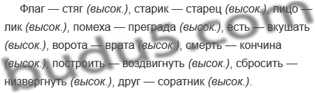 Флаг — стяг, старик — старец, лицо — лик, помеха — преграда, есть — вкушать, ворота — врата, смерть — кончина, построить — воздвигнуть, сбросить — низвергнуть, друг — соратник.