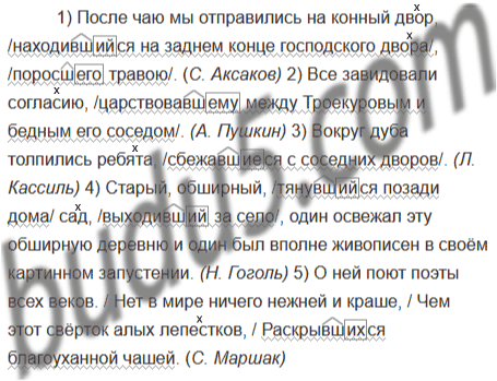1) После чаю мы отправились на конный двор, (находиться) на заднем конце господского двора, (порасти) травою. (С. Аксаков) 2) Все завидовали согласию, (царствовать) между Троекуровым и бедным его соседом. (А. Пушкин) 3) Вокруг дуба толпились ребята, (сбежаться) с соседних дворов. (Л. Кассиль) 4) Старый, обширный, (тянуться) позади дома сад, (выходить) за село, один освежал эту обширную деревню и один был вполне живописен в своём картинном запустении. (Н. Гоголь) 5) О ней поют поэты всех веков. / Нет в мире ничего нежней и краше, / Чем этот свёрток алых лепестков, / (Раскрыться) благоуханной чашей. (С. Маршак)