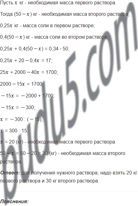 Есть два водно-солевых раствора. Первый раствор содержит 25%, а второй - 40% соли. Сколько килограммов каждого раствора надо взять, чтобы получить раствор массой 50 кг, содержащий 34% соли?