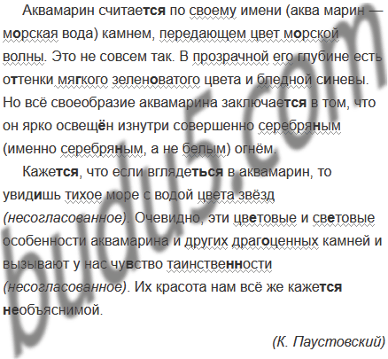 Аквамарин считает(?)ся по своему имени (аква марин — м..рская вода) камнем, передающем цвет м..рской волны. Это не совсем так. В прозрачной его глубине есть о..тенки мя..кого зелен..ватого цвета и бледной с..невы. Но всё своеобразие аквамарина заключает(?)ся в том, что он ярко освещ..н изнутри совершенно серебря(н, нн)ым (именно серебря(н, нн)ым, а не белым) огнём.