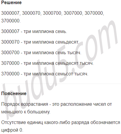 Задание № 5. Прочитай числа: 3000070, 3000700, 3007000, 3070000, 3000007, 3700000. Расположи их в порядке возрастания.