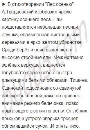 ► В стихотворении "Лес осенью" А.Твардовский изобразил яркую картину осеннего леса. Нам представляется небольшая лесная опушка, обрамлённая лиственными деревьями в ярко-жёлтом убранстве. Среди берёз и осин выделяются высокие стройные ели. Меж их тёмно-зелёных верхушек виднеется голубовато-серое небо с быстро плывущими белыми облаками. Тишина. Одинокий подосиновик со сдвинутой набекрень шляпой даже не привлёк внимание рыжего бельчонка, ловко прыгающего с ветки на ветку. От лёгких прыжков шустрого зверька треснет обломившийся сучок...И опять тихо.