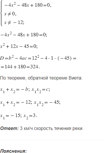 По течению реки от пристани отплыл плот. Через 4 ч от этой пристани в том же направлении отчалила лодка, догнавшая плот на расстоянии 15 км от пристани. Найдите скорость течения реки, если собственная скорость лодки составляет 12 км/ч.