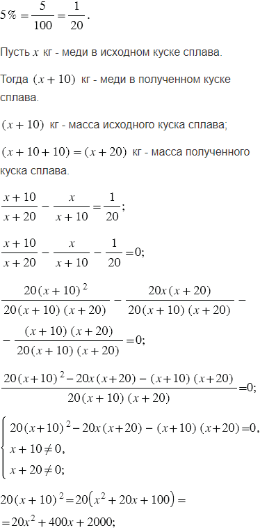 Кусок сплава меди и цинка, содержавший 10 кг цинка, сплавили с 10 кг меди. Полученный сплав содержит на 5% меди больше, чем исходный. Сколько килограммов меди содержит исходный кусок сплава?