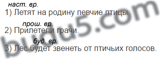 Летят (наст. вр.) на родину певчие птицы. Прилетели (прош. вр.) грачи. Лес (что будет делать?) будет звенеть (буд. вр.) от птичьих голосов.