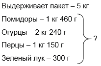 В магазине купили 1 кг 460 г помидоров, 2 кг 240 г огурцов, 1 кг 150 г перца и 300 г зеленого лука. Донесет ли покупатель овощи до дома в пакете, который выдерживает груз до 5 кг?
