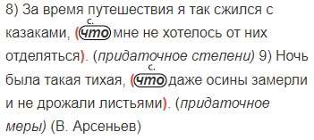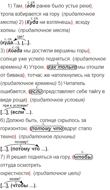 1) Там где ранее было устье реки тропа взбирается на гору. 2) Куда ни взглянешь всюду холмы. 3) Когда мы достигли вершины горы солнце уже успело подняться. 4) Утром как только мы отошли от бивака тотчас же натолкнулись на тропу. 5) Читатель ошибается если представляет себе тайгу в виде рощи. 6) Должно быть солнце скрылось за горизонтом потому что вдруг стало темно. 7) Я решил подняться на гору чтобы оттуда осмотреть окрестности. 8) За время путешествия я так сжился с казаками что мне не хотелось от них отделяться. 9) Ночь была такая тихая что даже осины замерли и не дрожали листьями. (В. Арсеньев)