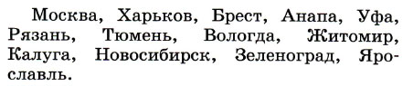 Спиши названия городов в алфавитном порядке.