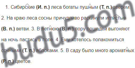 1. Сибирские леса богаты пушным зверем. 2. На краю леса сосны причудливо раскинули иглистые ветви. 3. В летнюю пору лошадей выгоняют на ночь пастись в поле. 4. ему хотелось полакомиться сочными яблоками. 5. В саду было много ароматных цветов.